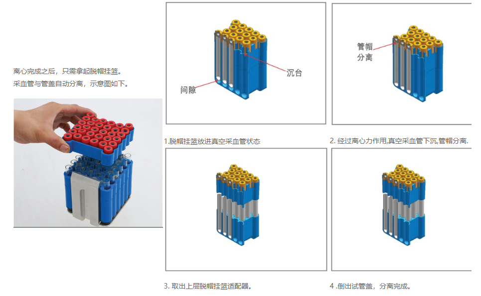 目前各级医院在采集血液样品时,普遍使用真空采血管,在使用离心机完成血液离心后人工拔去管盖,效率低;同时,拔管是产生的振动可能导致血液重新混合,并且增加病菌感染的风险。本公司研制的LTK128、LTK72自动脱帽离心机脱盖效果显著,彻底解决了各级医院往年真空采血管脱盖难的问题,是各级医院用于血液离心的离心仪器。
