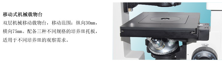 | 载物台 | 双层机械移动载物台,移动范围:纵向30mm,横向75mm。 | |